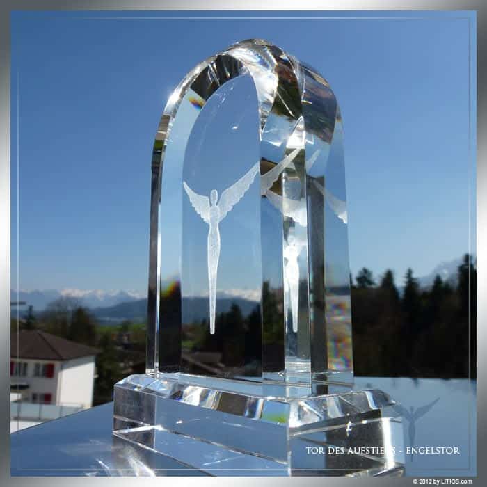 Cristal de alta calidad con finísimo pulido y figura de un ángel grabada con láser.