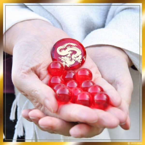 Crea un círculo de luz colocando las doce cuentas del dragón en el suelo (por ejemplo, sobre un algodón) y utiliza el medallón del dragón como punto central en el centro. Puedes meditar y hacer trabajo energético en este círculo solo o en grupo. Todo el mundo se siente cómodo, seguro y protegido en el fuego del dragón.