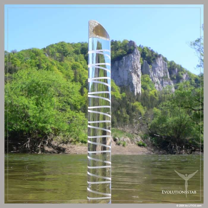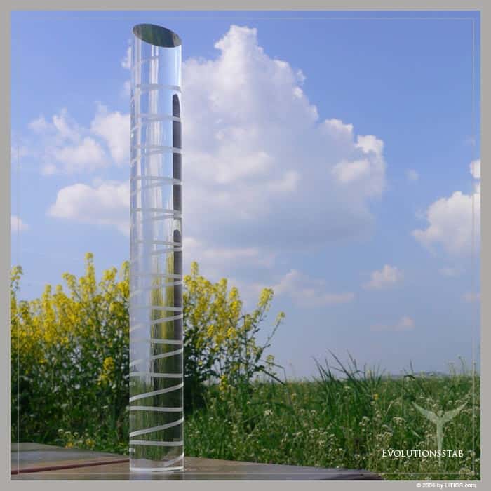Barra de Cristal con grabado de una espiral con sentido de giro izquierdo de 12 vueltas. Con pedestal de madera para apoyar.